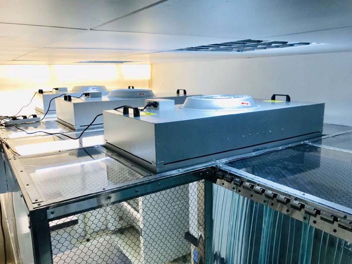 潔凈棚高效過濾單元2設(shè)置在風(fēng)機(jī)1下方,與風(fēng)機(jī)1緊密相連,高效過濾單元2可根據(jù)不同客戶的實(shí)際需要選擇不同的凈化級別,在高精科技的生產(chǎn)研發(fā)中,比如在半導(dǎo)體工業(yè)中,一般采用凈化級別很高的PTFE超高效過濾器;