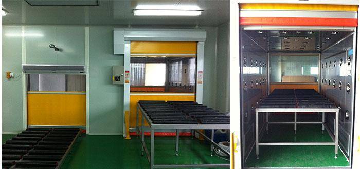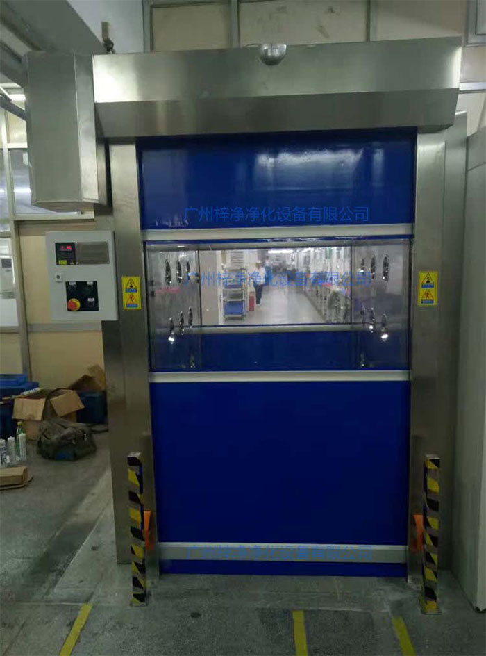 快速卷簾門貨淋室主要是方便推車、輸送帶傳遞物料時實現自動化控制、除塵的空氣凈化設備,快速卷簾門貨淋室前門和后門設置為互鎖狀態。快速卷簾門前門后門示意圖
